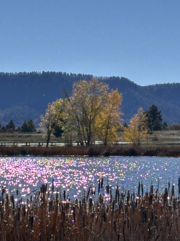 Jerry and I and the dogs took a hike the next day at Veterans Memorial Field. There is a pond in the field with a bench or two affording views of the fields and beyond. This hike became my favorite. Easy to reach, and easy to stretch the 2-mile loop around the pond into something more expansive into the nearby fields. The countryside around here is primarily large ranch lands. The San Juan Mountains range shapes the horizon–some tops already snow-covered. Pagosa Peak tops out at 12,600 ft.
